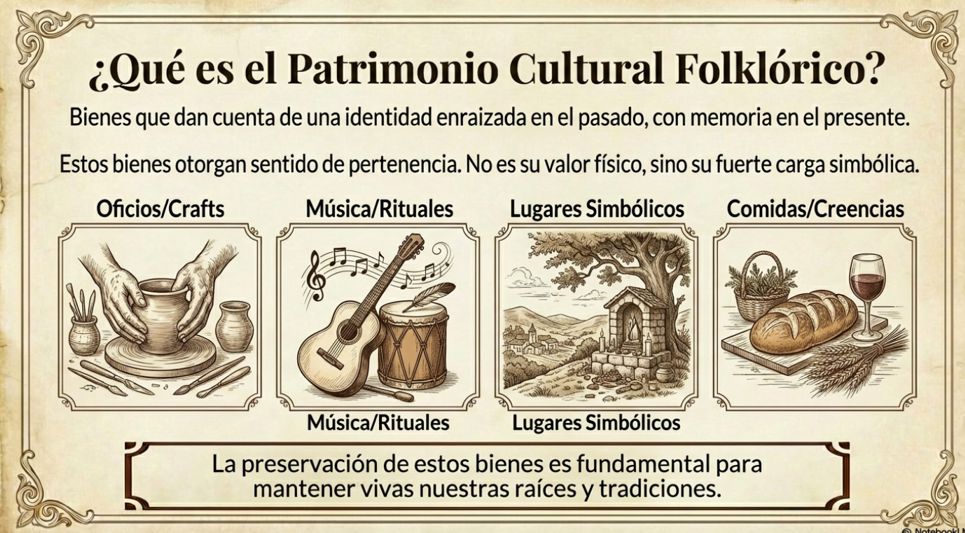 La definición que manejamos: “Son los bienes que dan cuenta de una identidad enraizada en el pasado, con memoria en el presente, reinterpretadas por las sucesivas generaciones, que tienen que ver con saberes cotidianos, entramados sociales y convivencias diarias. Estos bienes hablan, por ejemplo, de la singularidad de ciertos oficios, músicas, bailes, creencias, lugares, comidas, expresiones artísticas, rituales o recorridos de "escaso valor físico pero con una fuerte carga simbólica". Todas sus manifestaciones son complejas, dinámicas y por lo tanto modificables y mantienen una interdependencia mutua. Tanto el Patrimonio material, como el inmaterial componen el Patrimonio Cultural Folklórico de cada “grupo social” o “comunidad”. Se construyen históricamente, como resultado de las interacciones sociales, que otorgan especial sentido de pertenencia a la sociedad que los originó. El Patrimonio Cultural Foklórico impregna cada aspecto de la vida del individuo y está presente en todos los bienes que componen el Patrimonio Cultural: monumentos, objetos, paisajes y sitios. Todos estos elementos, productos de la creatividad humana, por lo tanto hechos culturales, se heredan, se transmiten, modifican y optimizan de individuo a individuo y de generación en generación.