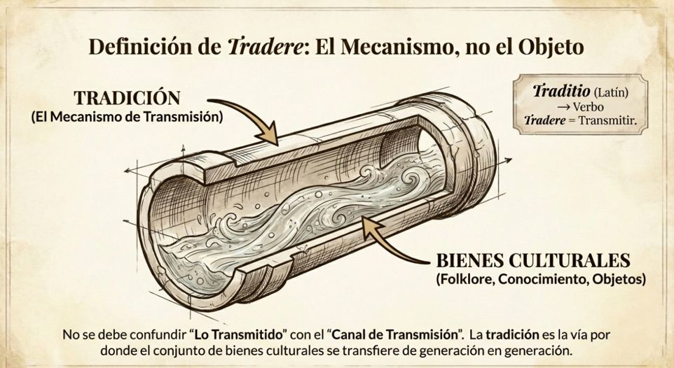 Etimológicamente, la palabra deriva del latín TRADITIO, que a su vez proviene del verbo TRADERE, cuyo significado es transmitir. En términos conceptuales, esta es la idea central: la tradición es un mecanismo por el cual el conjunto de bienes culturales se transfiere de generación en generación. No es, por tanto, el objeto cultural en sí mismo, sino el proceso de su entrega. La tradición es el mecanismo, no el contenido.